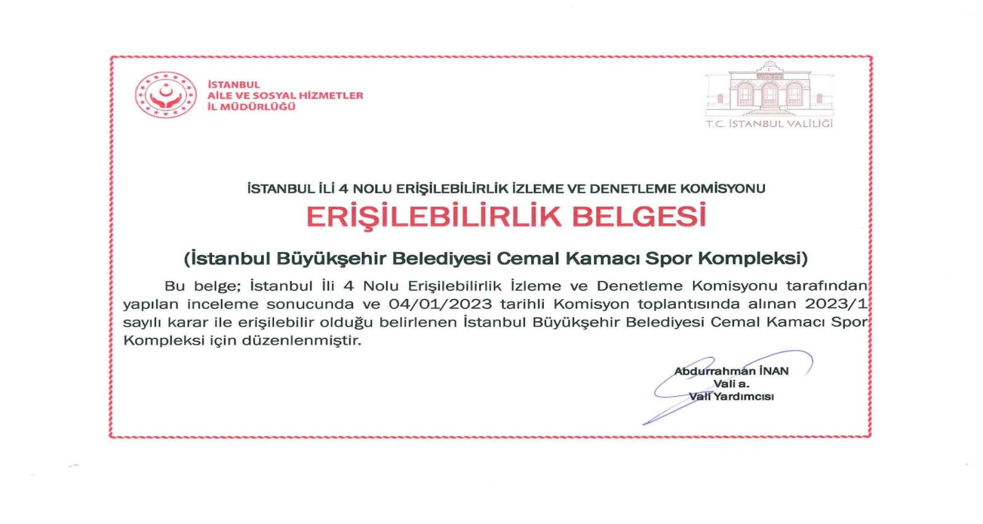 Engelliler için yapılan tüm bu çalışmaların ardından Aile ve Sosyal Hizmetler Bakanlığının koordinesinde İstanbul Valiliği tarafından tesise Erişilebilirlik Belgesi verildi. Engelli bireylerin kullanımı açısından tüm standartların yerine getirildiği Cemal Kamacı Spor Kompleksi hem İBB’ye ait spor tesislerinin içinde hem de İstanbul genelinde ilgili bakanlıklar ve kurumların incelemesinin ardından bu belgeyi alan ilk spor tesisi oldu.